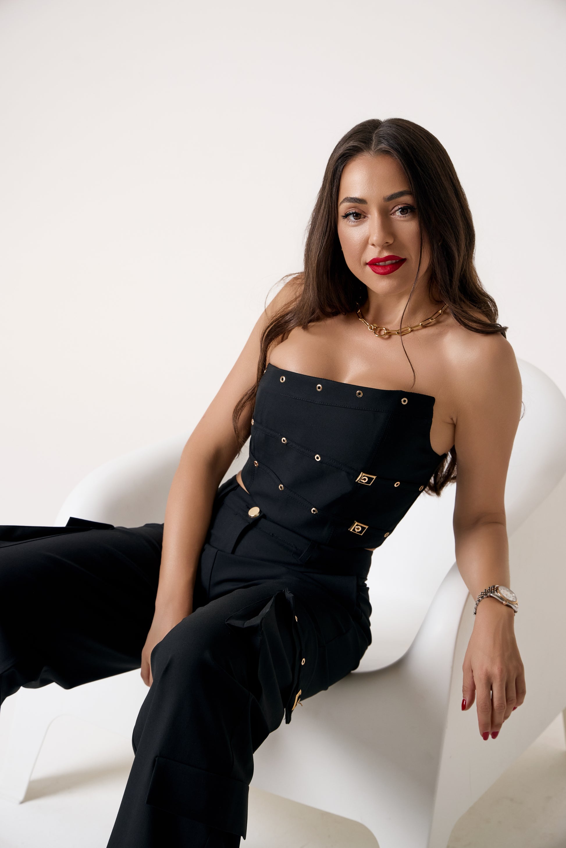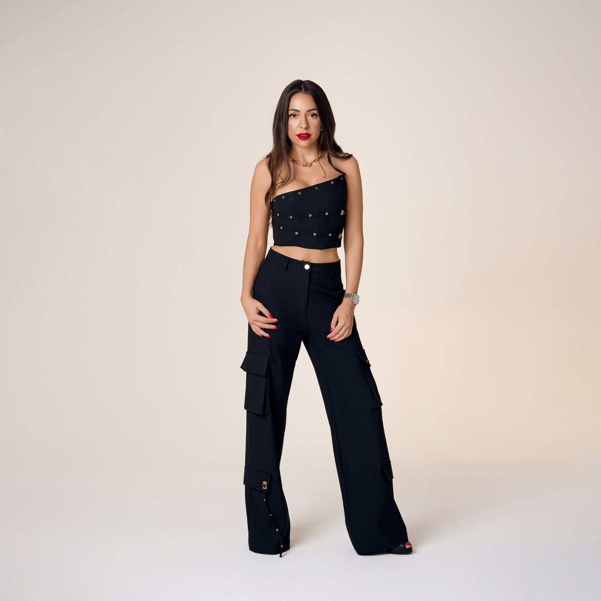 Sleek black co-ord set featuring an asymmetric one-shoulder crop top with gold eyelet details and matching wide-leg cargo pants. A bold and modern silhouette perfect for statement dressing.